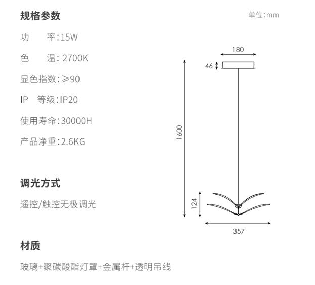如翼吊灯用双层弯曲的造型作为主要造型特征形成在空间里自由灵动的造型,,以一定的角度倾斜,,形成丰富的画面,,,,两翼的线条均为精心设计,,精准控制光线的传播,,,将直下光和漫反射光结合,,,,70%灯光向下,,30%灯光向上,,,,在空间里形成舒适的光学效果,,下灯罩为片状玻璃印刷专门调制的乳白色油墨,,,,热弯成对应弧度,,灯光透过灯罩呈现出更加柔和的视觉效果;边缘特意留有5mm宽度透明环,,使视觉更精致轻巧;灯罩利用两个金属“领夹”式的杆连接固定,,整体视觉优雅;